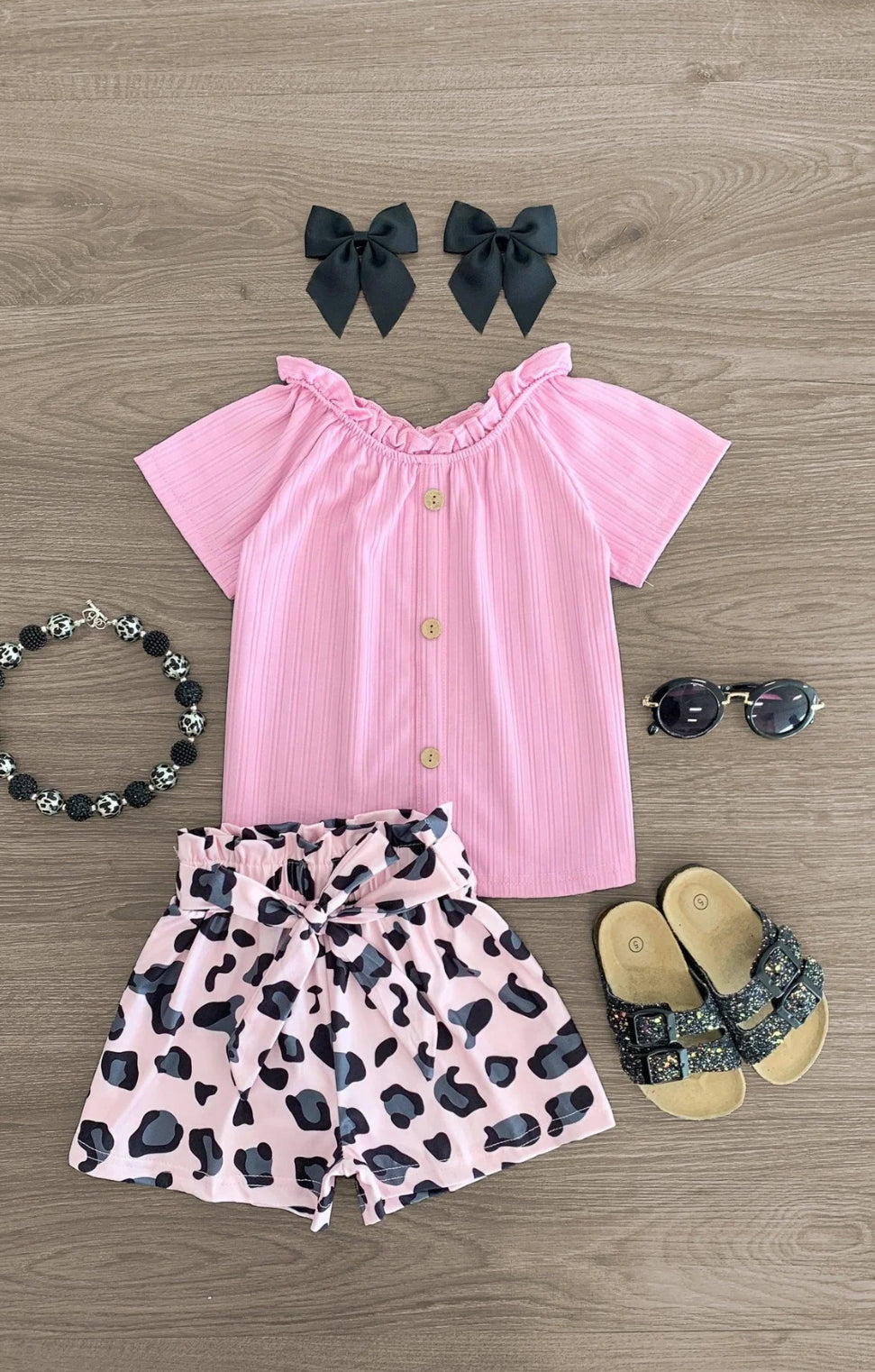 Bring on the warmer weather with this Light Pink Cheetah Tie Short Set for girls. This set features a ruffle neckline top with decorative buttons down the front. This top looks adorable paired with the matching tie shorts. The stretchy waistband helps comfort and fit and can be great for on the go, while the pink cheetah details add a fun pop to her look.