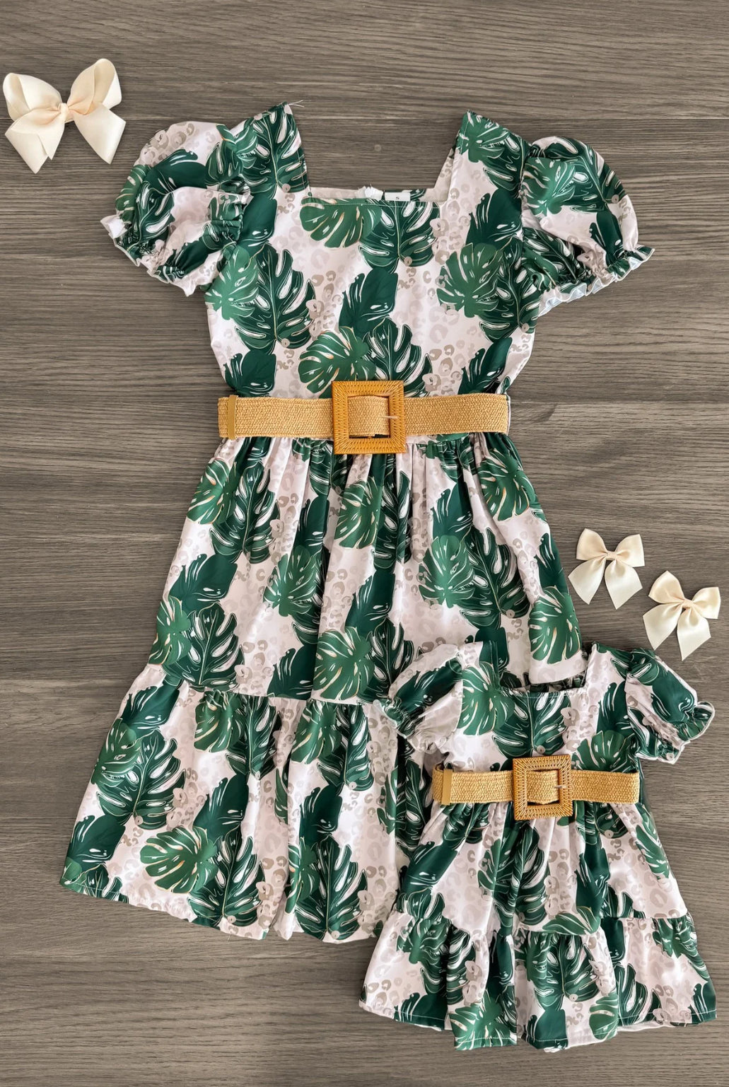 These Tropical Leaf Leopard Dresses features short sleeves and an allover tropical leaf and leopard print. The knee-length dress is made from soft and breathable fabric that will keep her comfy during all adventures.