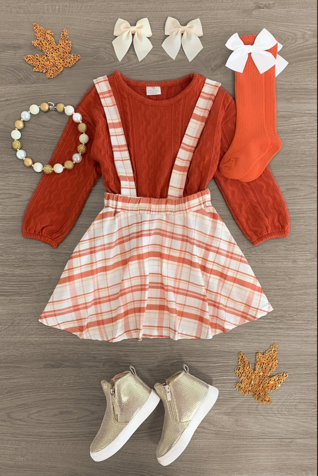 Orange Knit Sweater Plaid Suspender Skirt Set