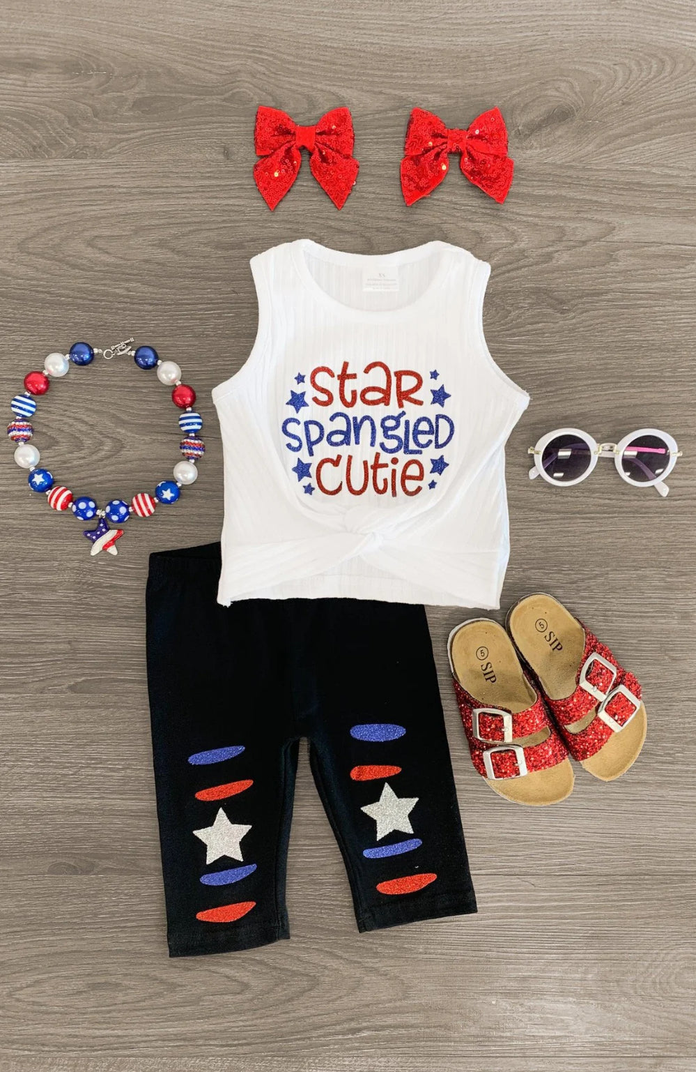 Our "Star Spangled Cutie" Glitter Capri Set for girls is perfect for Memorial Day or 4th of July celebrations.This girls' set is styled with a white tank top with a sweet, patriotic saying on the front, making it a staple addition to her warm weather wear. The top is paired with matching capri leggings with faux distressed glitter details for a fun touch.