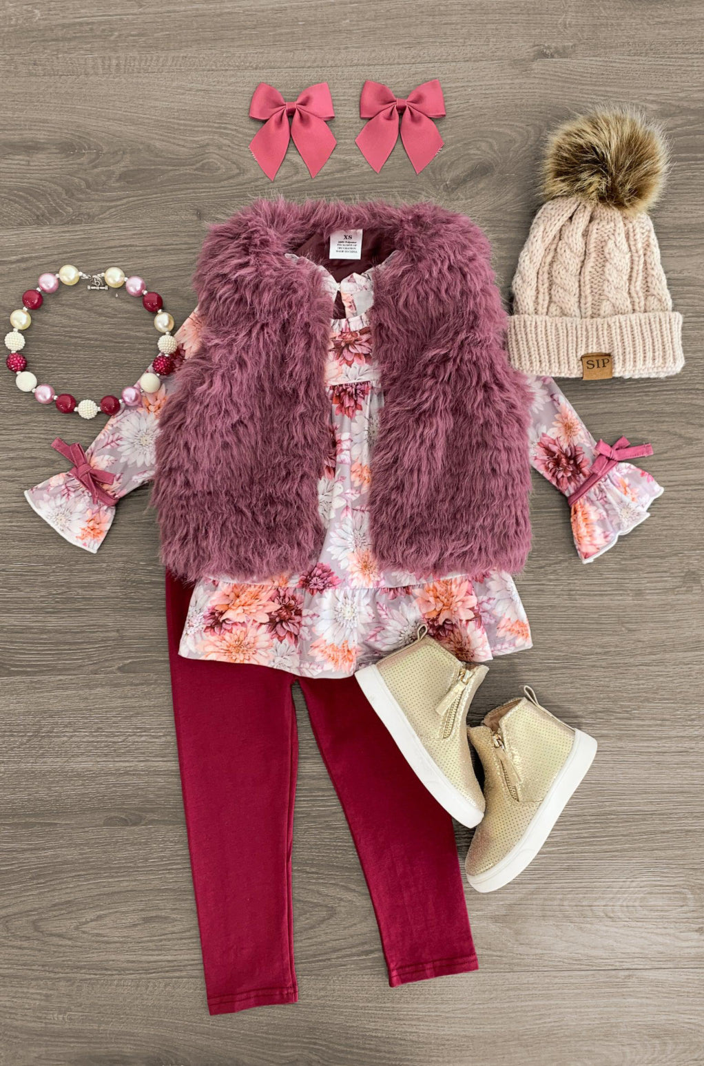 Bring on fall with this Plum Floral Fur Vest Set for girls. The long sleeve top features an allover floral print and looks adorable paired with the matching leggings & fur vest. The stretch waistband helps comfort and fit and can be great for on the go.