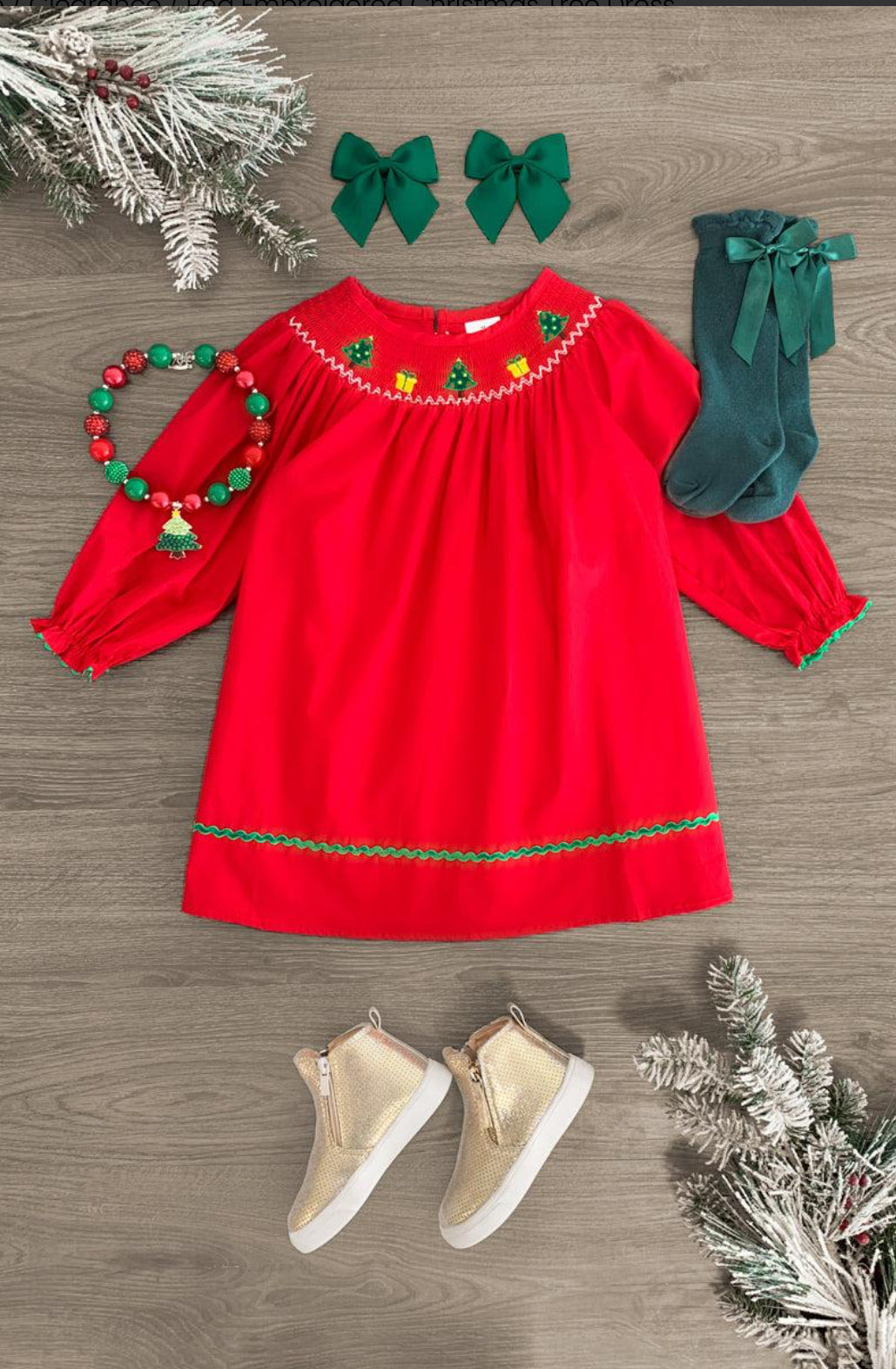 Add sweet fluttery style to her look with this Red Embroidered Christmas Tree Dress. This girls' dress is styled with a smocked Christas tree & present neckline and long sleeves, making it a staple addition to her holiday wear. Featuring a solid red design and green accents, it adds a playful twist of design to her look. The breathable fabric makes for cool and comfy wear, while the flowy style with button-closure behind the neck allows for simple dressing.