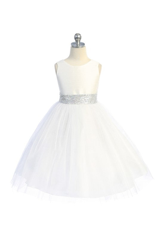 Sleeveless dupioni bodice with layers of glitter tulle skirt and rose gold sequin waist trim. The back bodice has a dramatic V accented with rose gold sequins. The dress is finished with a sequin bow in the back to make this the perfect party dress.